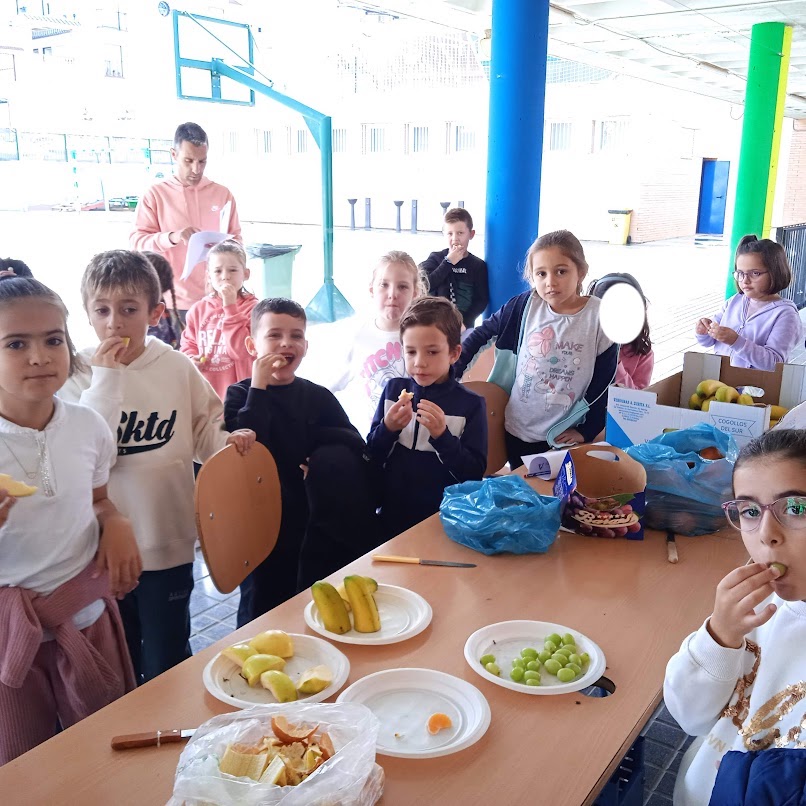 De primero a cuarto, hemos divido las clases en varios grupos que han ido acompañados por sus tutores y los maestros de EF, Antonio y Paco. Al llegar a los puntos marcados en el mapa debían hacer un reto saludable (confeccionar un desayuno o menú saludables, enumerar alimentos no saludables, enumerar acciones que nos lleven a tener una buena calidad de vida...). Al completar todos los retos, han elaborado una brocheta de fruta compuesta por mandarinas, plátano, manzanas y uvas. Les ha encantado la actividad.